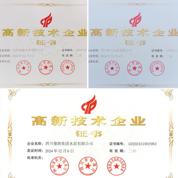 近日,西南(nan)水泥(ni)所屬達州利(li)森水泥(ni)有限公司(si)、四(si)川(chuan)(chuan)國大水泥(ni)有限公司(si)、四(si)川(chuan)(chuan)德勝集(ji)團水泥(ni)有限公司(si)被評為四(si)川(chuan)(chuan)省“高新技術(shu)企業”。