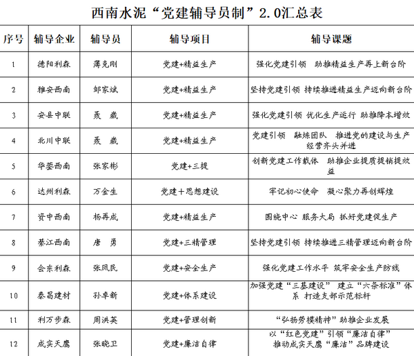 為深入貫徹習近平新時代中國特色社會主義思想和黨的二十大精神,落實中國建材集團“1345”黨建工作體系,西南水泥扎實實施“黨建輔導員制”,并積極推進 “黨建輔導員制”從1.0版的“工法化、體系化、流程化”向2.0版的“精細化、標準化、價值化”體系升級。