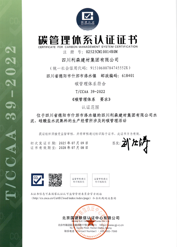 近日,西南水泥所屬四川利森建材集團有限公司在水泥及硅酸鹽水泥熟料生產經營中所涉及的碳管理活動成功通過北京國建聯信認證中心有限公司認證。