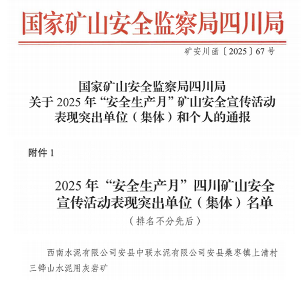 9月23日,國家礦山安全監察局四川局發布《關于2025年“安全生產月”礦山安全宣傳活動表現突出單位(集體)和個人的通報》,安縣中聯三鏵山水泥用灰巖礦榮列榜單。
